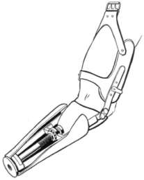The Robin-Aids elbow (Fig. 12) was designed for short below-elbow cases where flexion of the forearm is limited to less than 90 deg. or for those cases where the torque about the elbow is too weak to offer sufficient stability. Full extension of the stump forces a lever into a detent on a segment about the elbow axis, locking the forearm in flexion.