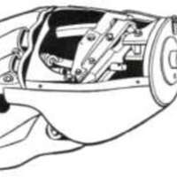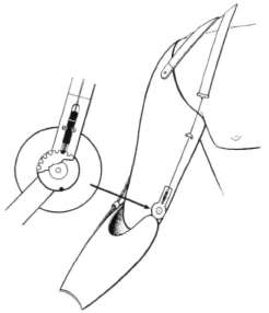 An alternating-type control for the locking mechanism is the prominent feature of the Northrop Model C elbow (Fig. 13). The first pull on the control cable drops a lever into a detent on a sector, resulting in a positive locking action about the elbow axis. The next pull on the control cable removes the locking level from the detent, thereby making the forearm free to rotate about the elbow axis. Eleven locking positions are available. In the average above-elbow case, the control cable is generally actuated by humeral extension, leaving the other hand or prosthesis, as the case may be, free. The excursion required, about 3/8-in., is so slight that after some practice most amputees are able to operate the locking unit with a motion that goes unnoticed.