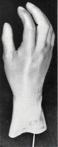 The APRL hand is covered by a cast polyvinyl chloride glove of extremely natural appearance (Fig. 2). Developed especially for the APRL hand, it has been designed with particular regard to eliminating as much as possible the resistance to operation of the fingers. In order to reduce the necessarily high cost of coloring each glove on a custom basis, after careful experimentation six Caucasian and six Negroid shades have been provided. They satisfy the majority of amputees.