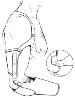 The APRL-Sierra side-locking elbow hinge (Fig. 15) was developed expressly for elbow disarticulation and for very long above-elbow cases where insufficient room exists for the fully enclosed type of elbow unit. An alternating-type locking unit on the outside of the inner hinges permits locking and unlocking of the elbow by humeral extension, as in the case of the standard above-elbow amputee. This unit may also be used on short below-elbow cases where use of the Robin-Aids forearm-actuated lock is not feasible.