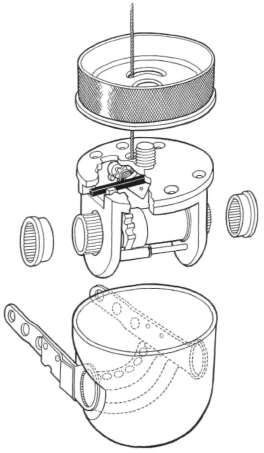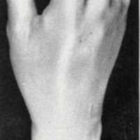 As the name implies, in the APRL voluntary-closing hand (Fig. 1) prehension force is obtained voluntarily by the amputee. Tension applied to a control cable closes the index and middle fingers against the thumb in a three-jaw-chuck pattern. These one-piece, hollow, metal fingers move through a 1 1/2-in. range, but since the thumb tip can be set in either of two positions 1 1/2-in. apart, objects up to 3 in. wide can be grasped. Finger angles are such that a grasped object is forced inward toward the palm. Security of grasp is further increased by the use of felt pads on the inner surfaces of the fingers and thumb. Any degree of prehensile force up to about 35 lb. can be obtained. The ring and little fingers are of cast latex and are attached so that they roughly conform to the shape of the object being handled.