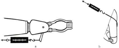Test: a) Disconnect the control cable from the terminal device, and attach the scale to hook-operating lever or hand-operating cable (Fig. 3a). Place a 3/4-in. block between the fingers and pull until the block slips out of a voluntary-opening hook or until the fingers of a voluntary-closing hook or hand just close on the block. Note the force at this instant.