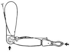 Test: Tape the fingers of the terminal device closed and unlock the elbow. Insert the spring scale through the cable attachment, and flex the forearm to 90 deg. while holding the socket stationary. Pull along the normal line of the cable until further flexion of the forearm just starts, and note the force.