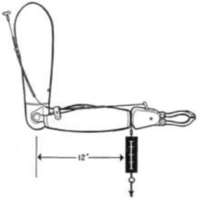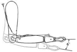Test: Tape the fingers of the terminal device closed and unlock the elbow. Hook the spring scale over the prosthesis at a distance of 12 in. from the elbow pivot using a leather strap if necessary (Fig. 5). Flex the forearm to 90 deg., and have the amputee actively resist while applying a straight-down pull on the scale. Note the scale reading when the amputee can no longer completely resist the pull and the forearm slips below 90 deg.