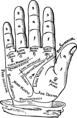 Fig. 10. Principal lines and mounts of the hand as charted by Patritio Tricasso da Cerasari (Tricassus the Mantuan), a celebrated chiromancer of the sixteenth century. From Lenssen, by permission of The Studio Publications, Inc., New York City.
