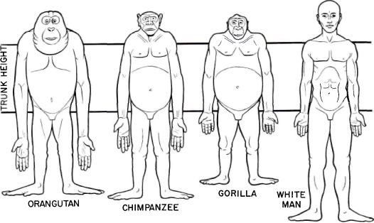 Fig 4. Exact diagrammatic front views of the four largest primates at fully adult age, drawn from detailed measurements on actual specimens, hair omitted, and all reduced to the same trunk height. From Romer, by permission of The University of Chicago Press. Originally constructed by A. H. Schultz. Note that, from orang to chimp to gorilla to man, both limb length and hand length generally decrease with respect to trunk height. Only the gorilla has a hand shorter than that of man.