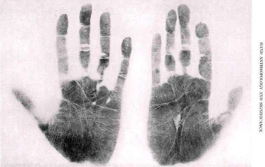 The human hand appears in quasi magico-religious silhouettes of complete or partially mutilated hands outlined in color on the walls of the grotto of Gargas in the Pyrenees Mountains. The fingers appear to be cut off at the distal end of the first phalanx, with one or more digits missing entirely. Curiously, the thumb never is amputated. The same type of finger mutilation is found in wall paintings in the caves of central Australia. Apparently the practice was customary among the early Aurignacian people of Paleolithic times, and it also is reported in other preliterate tribes. According to Osborn , Breuil believes that painting had its beginning in these stencilled contours produced by laying the hands against the limestone walls and spreading red and black paint on the surrounding area. In other examples, the hand was covered with pigment and pressed against the wall.