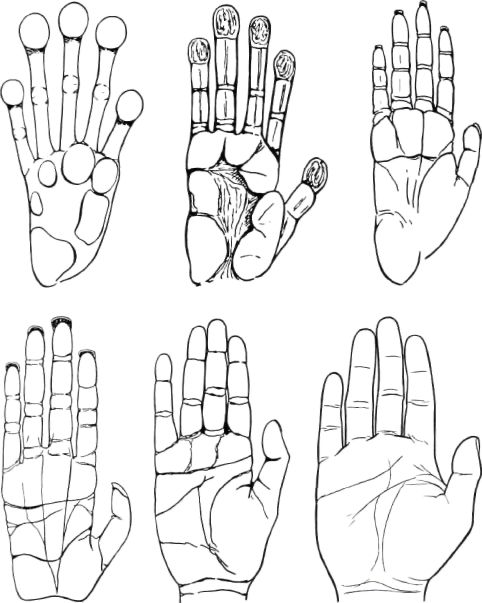 Fig. 2. Comparative proportions (not relative size) of the hands of man and of certain related ancestral forms. Top row, left to right, hands of a tarsier, of a lemur, and of a Rhesus monkey. Bottom row, left to right, hands of a chimpanzee, of a human with atypical simian characteristics, and of normal man. In all cases except that of the lemur, the digital formula is 3 > 4 > 2 > 5 > 1. From Jones, by permission of Bailliere, Tindall, and Cox, Ltd.