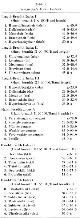 The morphology of the hand has proved useful in classifying hand types. Wechsler's system is based upon four hand dimensions (Fig. 5). From all possible combinations of length and three breadths, he derives six index categories, as shown in Table 1. Thus, the long, narrow hand type in man would be, for example, 1-1-1-2-4-3, that of the short, broad hand 4-4-4-4-4-4.