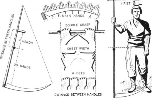 Fig. 9. The method, common among Latvian and other European peasants even today, of arriving at the proper dimensions for farm tools using the hand as the unit of measurement. From Drillis.