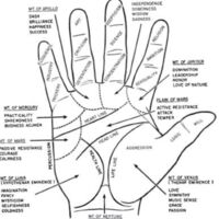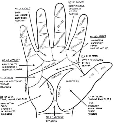 Fig. 11. The mounts and principal lines of the hand and the interpretative functions traditionally assigned to the several areas. Authorities differ in detail, but all follow the same general pattern. In palmistry, which dates from antiquity and which has been the subject of serious discussion by numerous scholars, including Aristotle, the relative development of the mounts and lines is considered to show the comparative ability of the subject to implement the talents and qualities associated with the individual features. Generally the mounts are seven in number, the eighth (Mount of Neptune) occurring in a comparatively small number of cases. Reference to the sun, moon, and planets relates, of course, to the influence which, in early philosophy, these celestial bodies were thought to exercise upon the course of an individual's life. Modern astrology calls upon similar relationships.