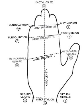 Fig. 5. Hand measurements according to Wechsler. From Krogman, by permission of Ciba Symposia.