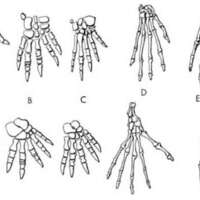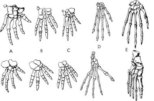 Fig. 3. The evolution of the hand (top row) and foot (bottom row), as revealed in skeletal structure. A, a primitive reptile; B, C, mammal-like reptiles; D, a lemur, representing a primitive mammalian type; E, man. Note the reduction in the number of joints in the toes, the specialization of the proximal ankle bones in mammals, some reduction in the number of wrist and ankle bones, and the variations in the thumb and great toe From Romer, by permission of The University of Chicago Press