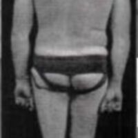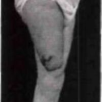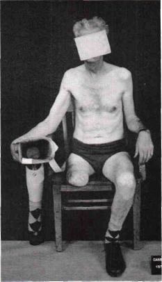 Physiologically, the patient appeared older than his age, but he was alert and cooperative. The abdomen was severely scarred from surgical incisions for appendectomy and double sympathectomy, and scars also extended from the distal end of the stump up the antero medial aspect to mid groin. The medial scars were deeply adhered to underlying tissue. Subcutaneous fat was moderate and musculature firm, with prominent adductors and gluteus maximus. There were no sensitive areas. Skin was normal. The femur extended 1 1/2 in. below the perineum and 7 in. below the great trochanter (Fig. 32 and Fig. 33). A spur extended upward on the medial side, and the stump showed some abduction contracture.