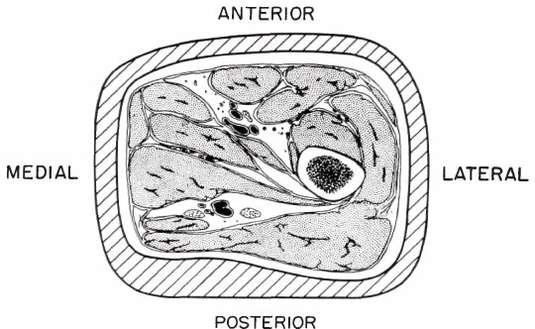 No special provision was made for relief of the adductor roll. The anterior wall provided no protuberance over the femoral triangle, and there was no special relief for the displaced section of the femur. The perimeter of the socket was 2 1/4 in. less than that of the stump at the proximal end, 3/4 in. less at the mid stump level, and equal to that of the stump at the end. The distance from the channel for the tendon of the adductor longus to the ischial seat was 4 1/2 in., the corresponding anatomical dimension being 3 3/4 in. This difference between medial socket width and anatomical measurement was subsequently found to be a major source of difficulty. Current practice is to have the medial width of the socket compare very closely with the anatomical measurement.