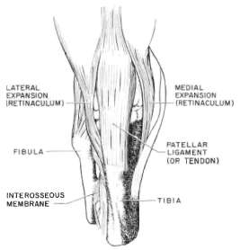 Branching out from the quadriceps tendon on each side above the patella are the lateral and medial retinacula (Fig. 6), which insert on the flares of the tibia. Like the patellar ligament, these tendons are capable of weight-bearing.