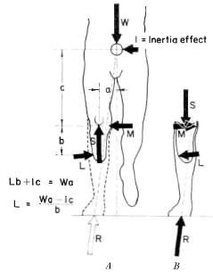 As indicated in Fig. 3, the horizontal acceleration of the body in a medial direction, due to the medial inclination of the total floor reaction R, results in a lateral inertia force which tends to oppose the acceleration. This inertia force must be included when consideration is given to balancing moments about the point of support. The correct relationship is therefore Lb + Ic = Wa: