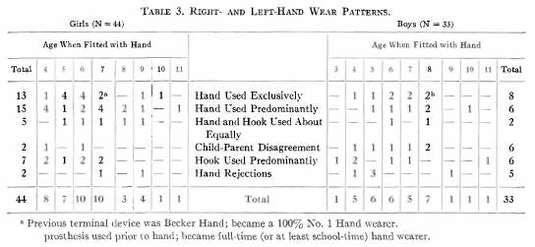 Of the 29 boys and 21 girls in the sample who were 6 years of age or over, 26 boys and 21 girls were either wearing the hand in school at the termination of the experiment or stated that they intended to do so when the fall term began. Included in this group were four of the children whose preferred device was the hook. Nevertheless, they wore the hand to school. One boy, age 8, summarized the opinion of these four children when he said, "I wear it because the kids like it better."