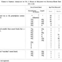 The clinics were then requested to report the following dimensions in all cases of noticeable discrepancy: circumference at the metacarpophalangeal knuckles, excluding the thumb, with hand in closed position (5% in, on the No. 1 Hand); and the length from the styloid process of the radius to the tip of the thumb (3 5/8 in. on the No. 1 Hand). Several clinics also reported hand dimensions of children for whom the No. 1 Hand was considered of appropriate size.