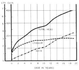 D. Zook, in 1930, made a thorough study of how body segment volume changes with age. In making this study, he used the immersion method for determining segment volumes. These were expressed in per cent of whole body volume. His sample consisted of youngsters between the ages of 5 and 19 years. His immersion technique was unique, but his claim that it permitted the direct determination of the specific gravity of any particular body segment does not seem to have been established. Some of his results are shown in Fig. 5 and Fig. 6.