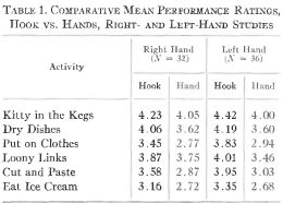 - In a total of 408 hook and hand performance comparisons shown in (Table 2) (68 children performing 6 activities with each device), hook performance was rated as superior in almost half the instances (189 times). Interestingly enough, however, hook and hand performances were rated as equal almost as frequently (184 times), although hand performance was considered better in only a relatively insignificant number of cases 29. In this tabulation of the data also, the superiority of the hook appears less marked in the same two test items "Kitty in the Kegs" and "Loony Links."