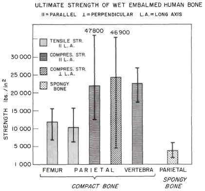 Fig. 9. Mean and range of variation in strength of various bones according to type (compact or spongy) and. direction of loading .