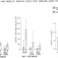 The ultimate compressive stress (strength) and strain, the modulus of elasticity, and the energy absorbed to failure were computed from stress-strain curves for wet-tested specimens. The density of air-dried specimens was determined with a strontium 90 densitometer developed by Evans, Coolbaugh, and Lebow . Dry specimens were used to avoid the effects of moisture that might be trapped within the interstices of the specimens. A total of 69 rectangular (standard) specimens and of 15 cubic specimens from 1 adult, white female, 3 adult, Negro males, and 6 adult, white males were tested. All specimens were kept in saline solution until tested. A minimum of 20 load-deformation readings were taken for each specimen during the test period.