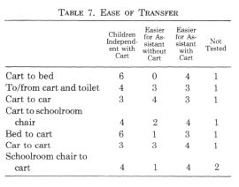 The majority of the children were independent in transfer activities (Table 7), e.g., cart to bed, toilet, or chair. The most troublesome transfer activities involved the toilet; presumably, these difficulties arose because of the narrowness of many bathroom doors and the lack of removable armrests on the cart.