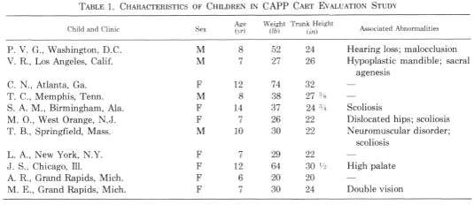 Since the cart was designed for the child with quadrimembral deficiencies, priority consideration was given to such candidates. The children were selected on the basis of the number of limb deficiencies and the degree of limitation. Eleven children from ten clinics participated in the study (Table 1). A twelfth child was provided with a cart (see Appendix) but not included in the sample, because this clinic already had two subjects represented in the study; additional data from the same reporters might have biased the study.