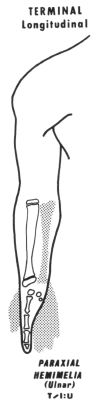 The term "hemimelia" was introduced in 1836-37 by Isidore Geoffroy Saint-Hilaire , who also introduced the term "teratology". In 1877, Verneuil proposed subdivision (of "ectromelia") into longitudinal and transverse varieties . In addition to absence of the distal half (two of the four segments) of a limb, it became clear that, in some cases, only one side of the distal half was affected, and such instances were named (after the defective portion) "radial," "ulnar," "tibial," and "fibular" hemimelia. By 1903, a further distinction, that between terminal and intercalary varieties of hemimelia, had been made. Finally, in 1951, O'Rahilly suggested the term "paraxial hemimelia" for the longitudinal variety, because either the preaxial or postaxial side of the limb is involved in such cases.