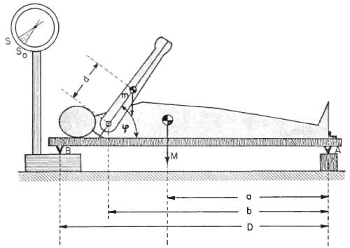 Nonetheless, the method has been used (Fig. 6). For the purpose, a board or platform is supported on two knife edges- one on a fixed base, the other on the platform of a weighing scale. The subject is. placed on the board in a position that can be maintained or reproduced if necessary. A reading is taken on the scale. The subject is then asked to flex the segment of interest (forearm, arm, etc.) through a given angle-usually 45 deg., 90 deg., or 135 deg. A new reading is taken. The mass of the segment can then be determined substituting the appropriate readings in the formula: Equation 6