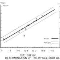 Whole-body volume may be approximated in several ways. The mass may be obtained by weighing accurately. The density is the ratio of mass to volume. For lean bodies, the density is higher than for fat bodies. One provisional formula for determining density, developed by Dupertuis in 1950, makes use of Sheldon's somatotyping system and introduces the first component (x) of the system into the equation: